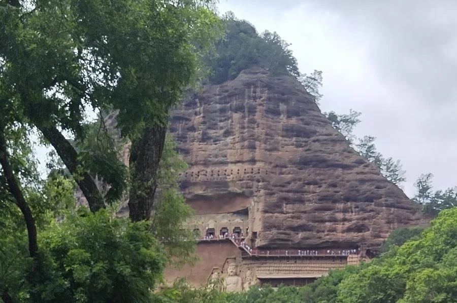 第五天,去天水,坐了一上午车,在天水一学校食堂吃的午餐。接着去了英语课本上的麦积山。山挺高。
